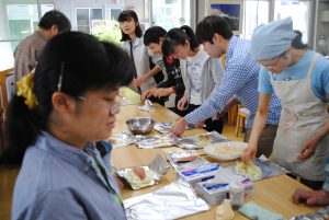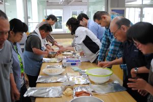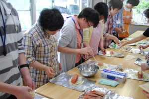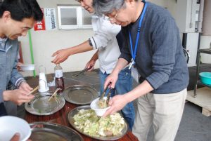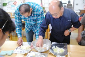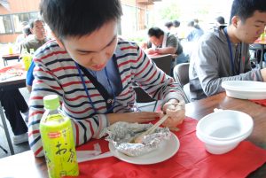 ホイルの上にまずは野菜をしきます。キャベツやもやし、それに玉ねぎもどっさり。その上に鮭をのせ、味付けは塩コショー・醤油・みりん・マヨネーズ・バター、そして最後にとろけるチーズをのせます。アルミ箔の上端と下端を閉じ合わせ、同様に左右の端も閉じ合わせたら出来上がり!どれが自分の作ったホイル焼きかわかるようにマジックで名前を書きます。あとは、分厚い鉄板の上において、約20分。美味しいにおいが立ち上ったら出来上がりです。