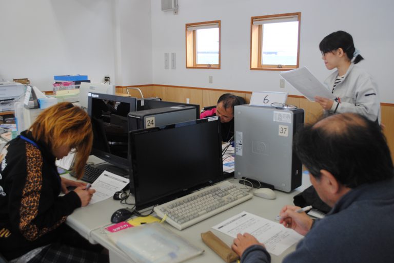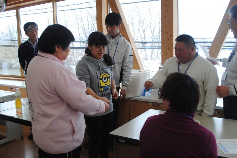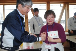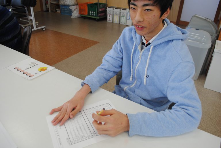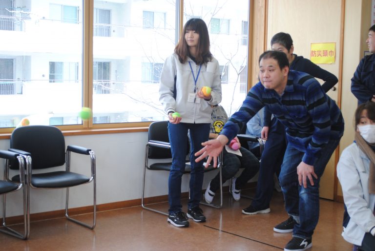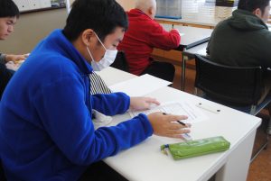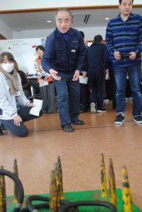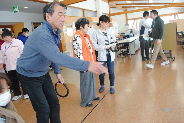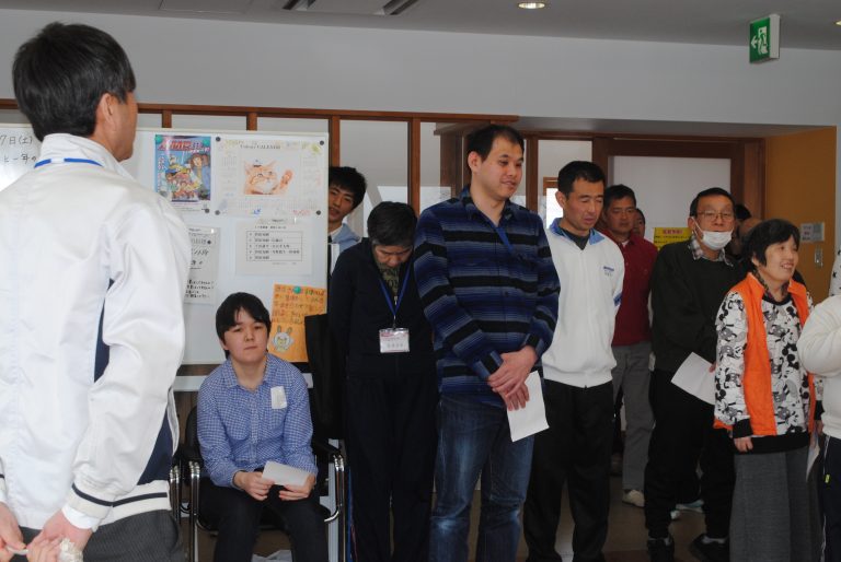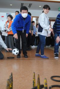 「今日は3つの種目にチャレンジしてもらいます。競技の後は、係の職員にエントリーカードをわたしてください。点数を記入してもらいます。上位10名には、コロニーベーカリーのパン券が贈られます。皆さん、ルールを守ってがんばってプレイしてください!」