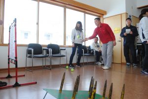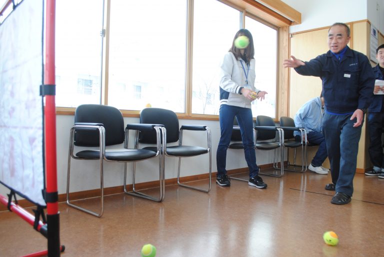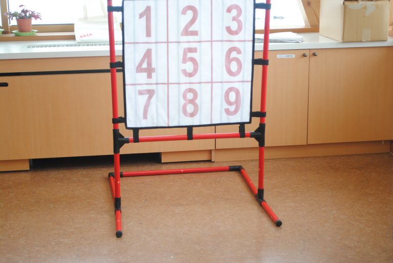 競技名 『ストラックアウト』 ボードにはマジックテープが付いているので、狙った数字にボールが当たると、くっつくようになっています。