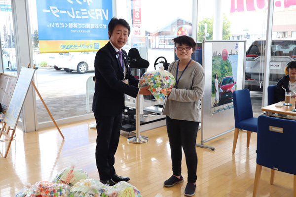 ネッツトヨタあかねヶ丘店稲毛店長様に、集まったキャップを贈呈します。