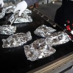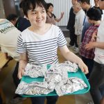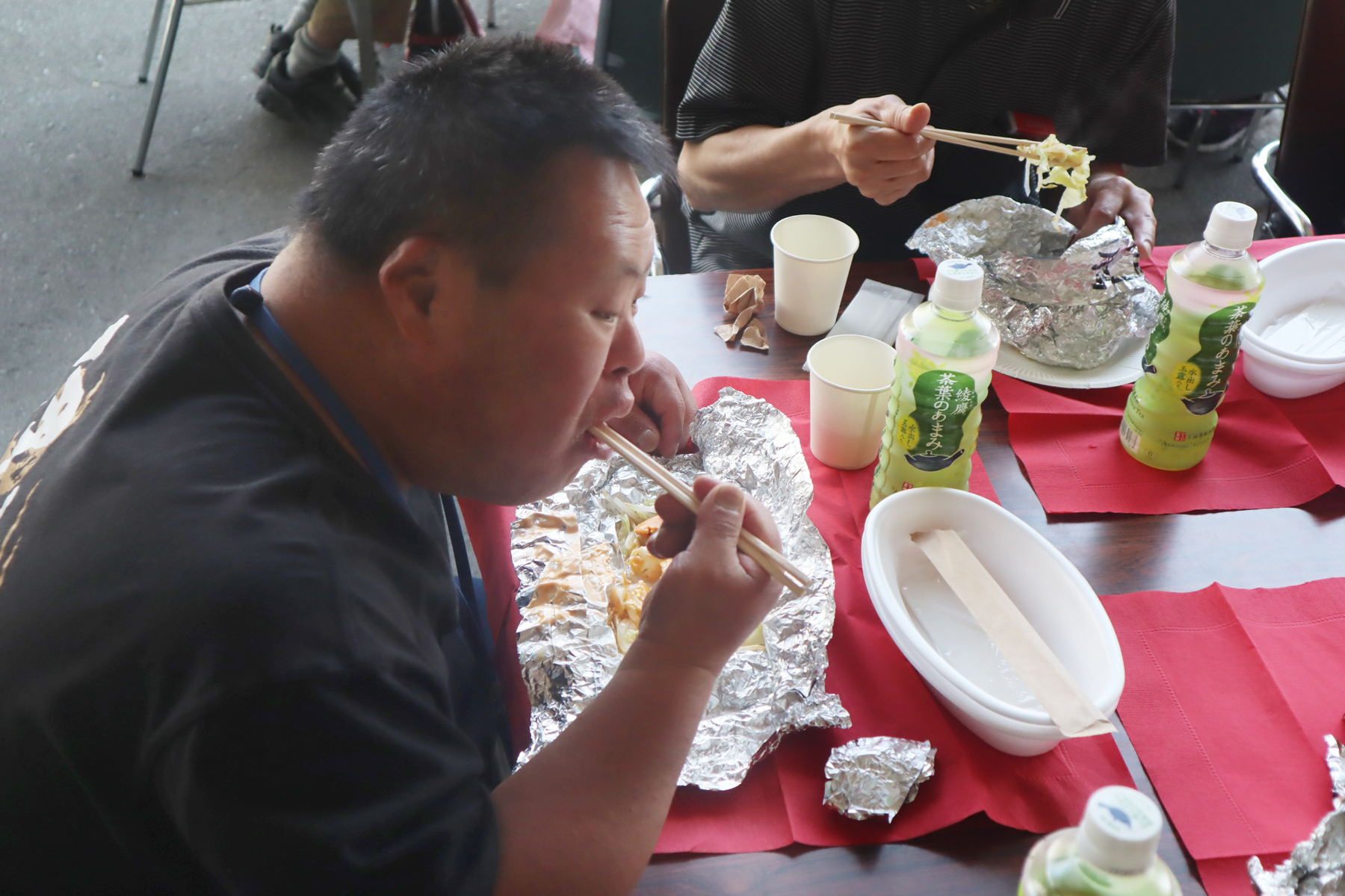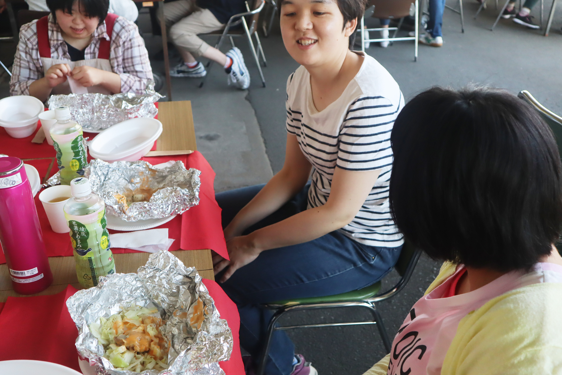 みんなが作ったホイル包みにネームを貼って、大きな鉄板に運びます。焼きあがったアツアツのホイル焼き。見た目はちょっとわるいけど、お味は最高です。