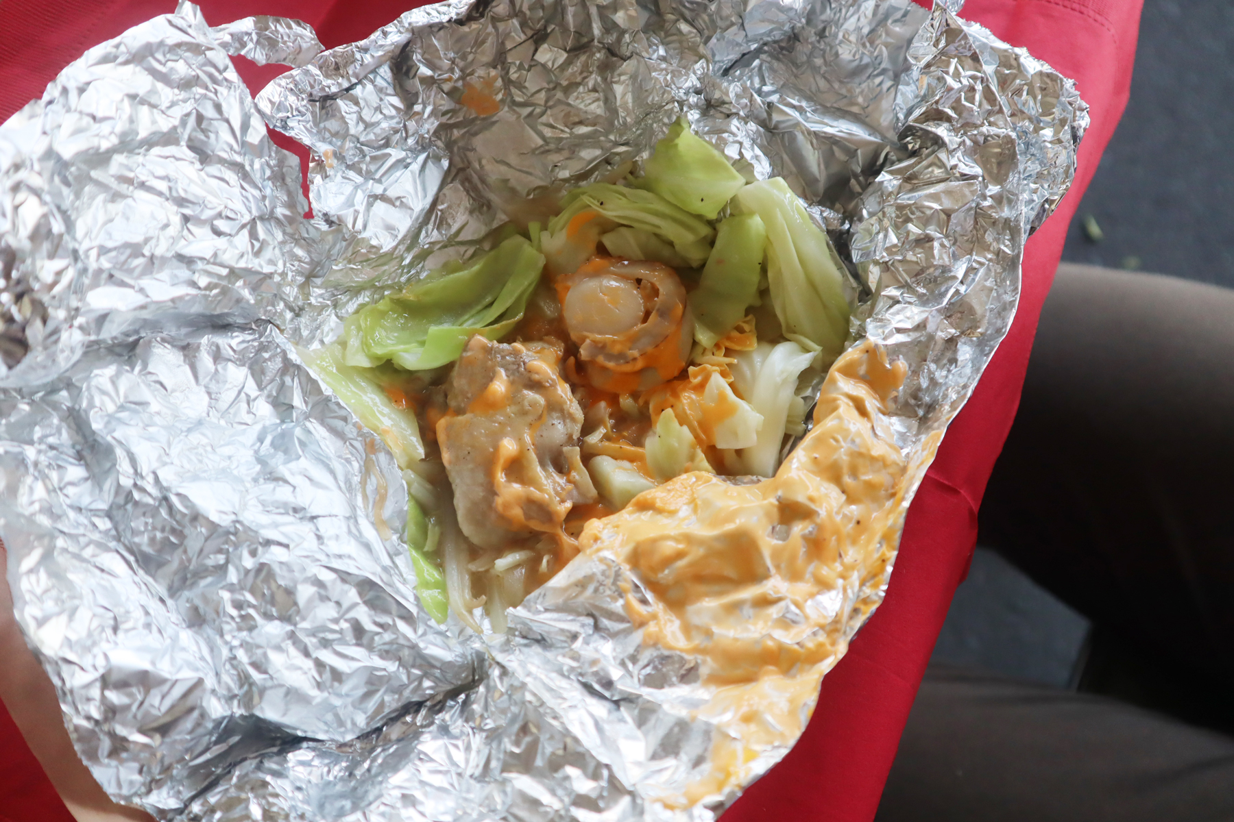 今年も<ホイル焼き>に挑戦です。具は、鶏肉にホタテ、キャベツに玉ねぎにもやしです。味付けは、魔法のタレにバターにチーズ。大き目のアルミホイルに上手に包めたかナ!