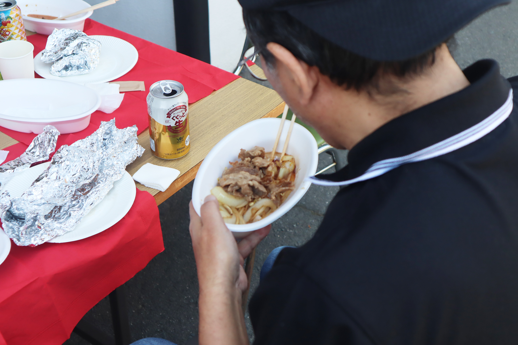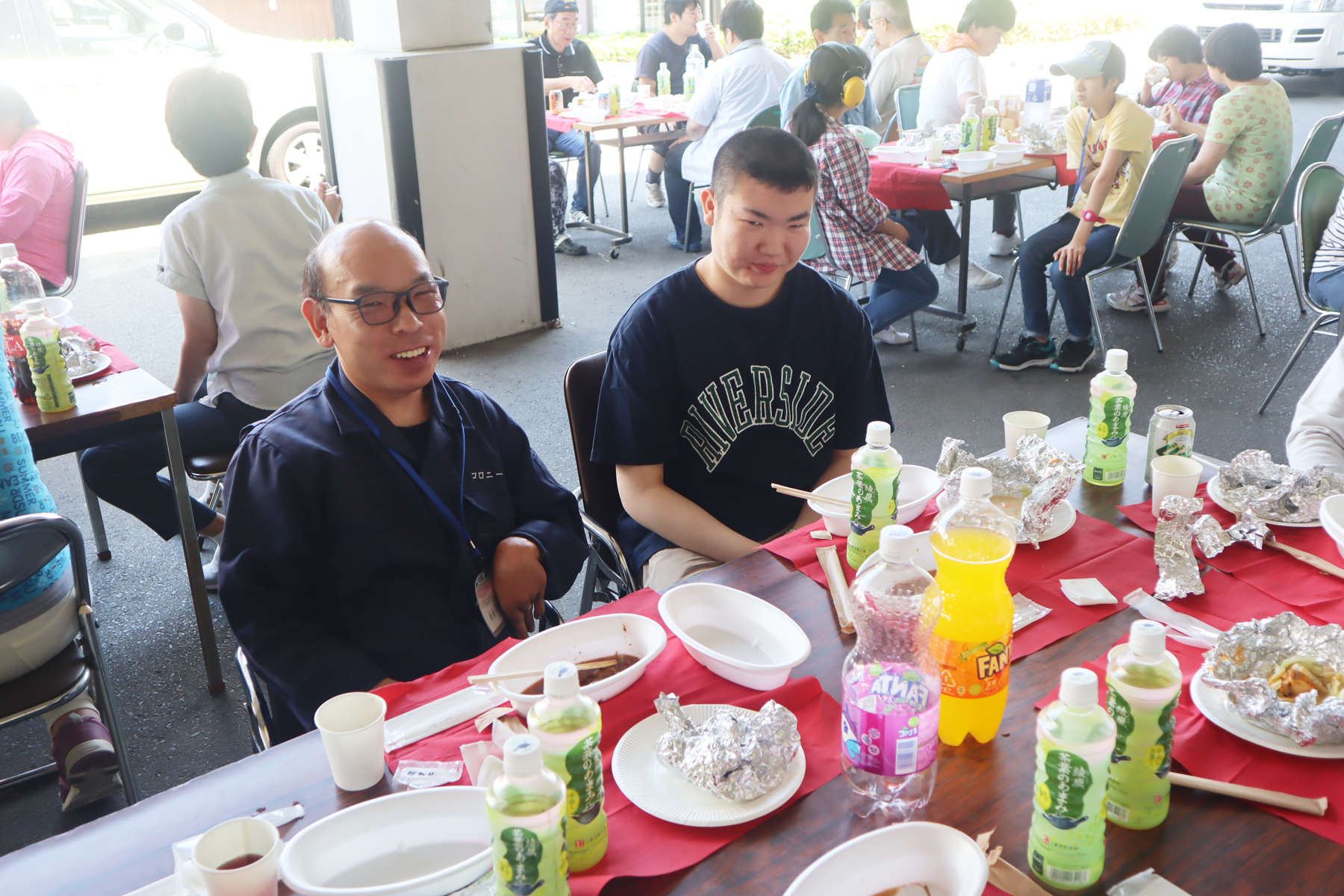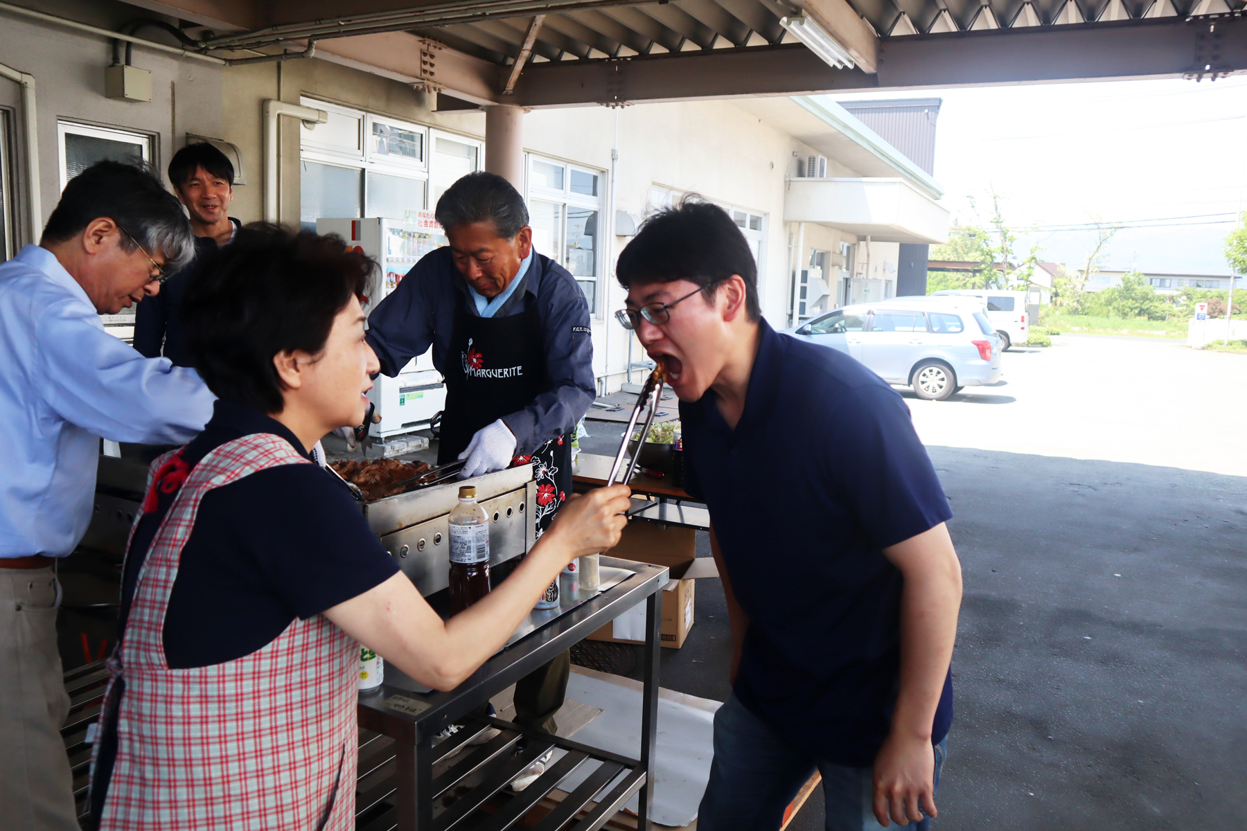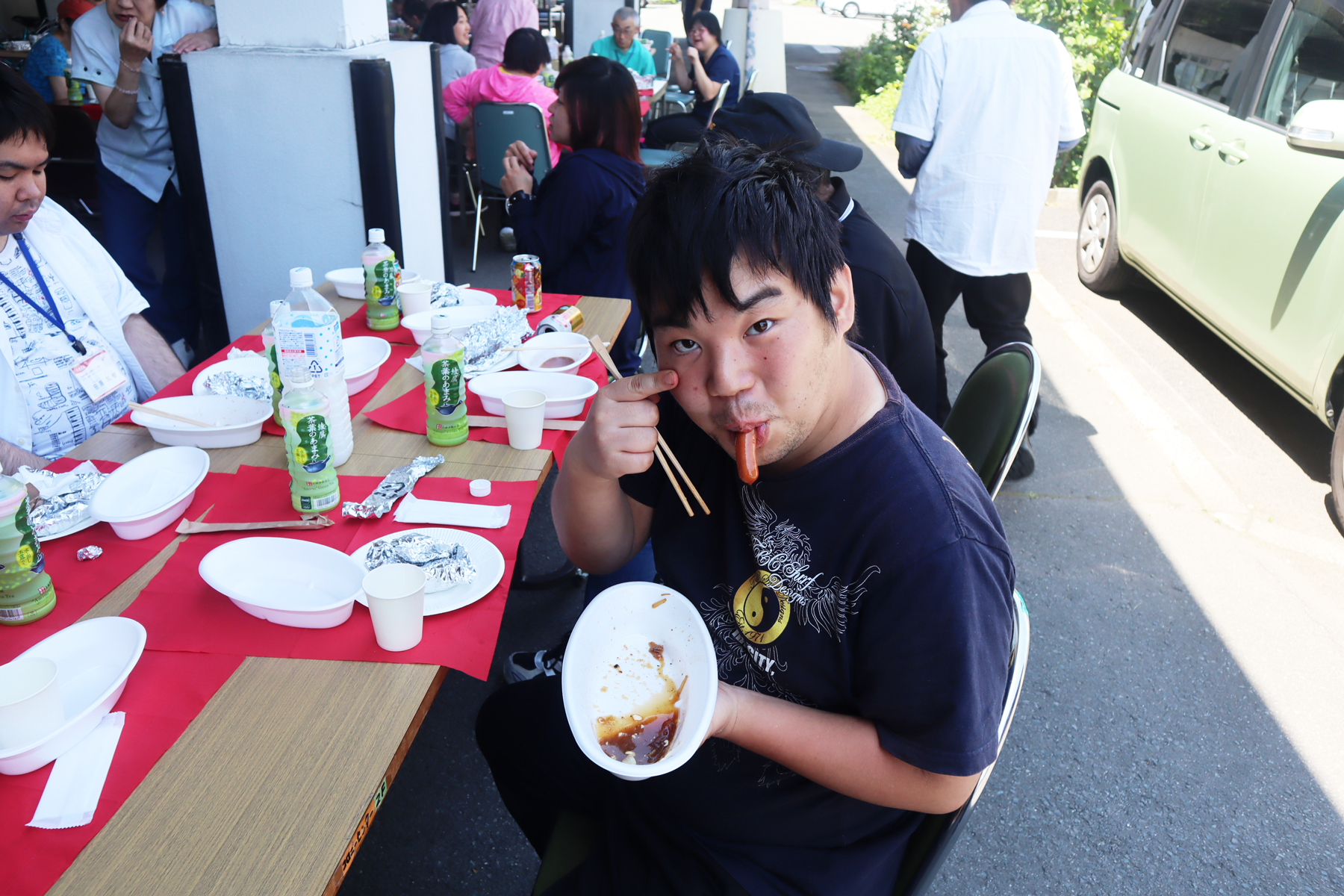 牛肉に豚肉、ソーセージにポテト。焼き担当は所長をはじめ、男性職員の担当です。焼いたそばからどんどん売れていきます。「おかわりー!」