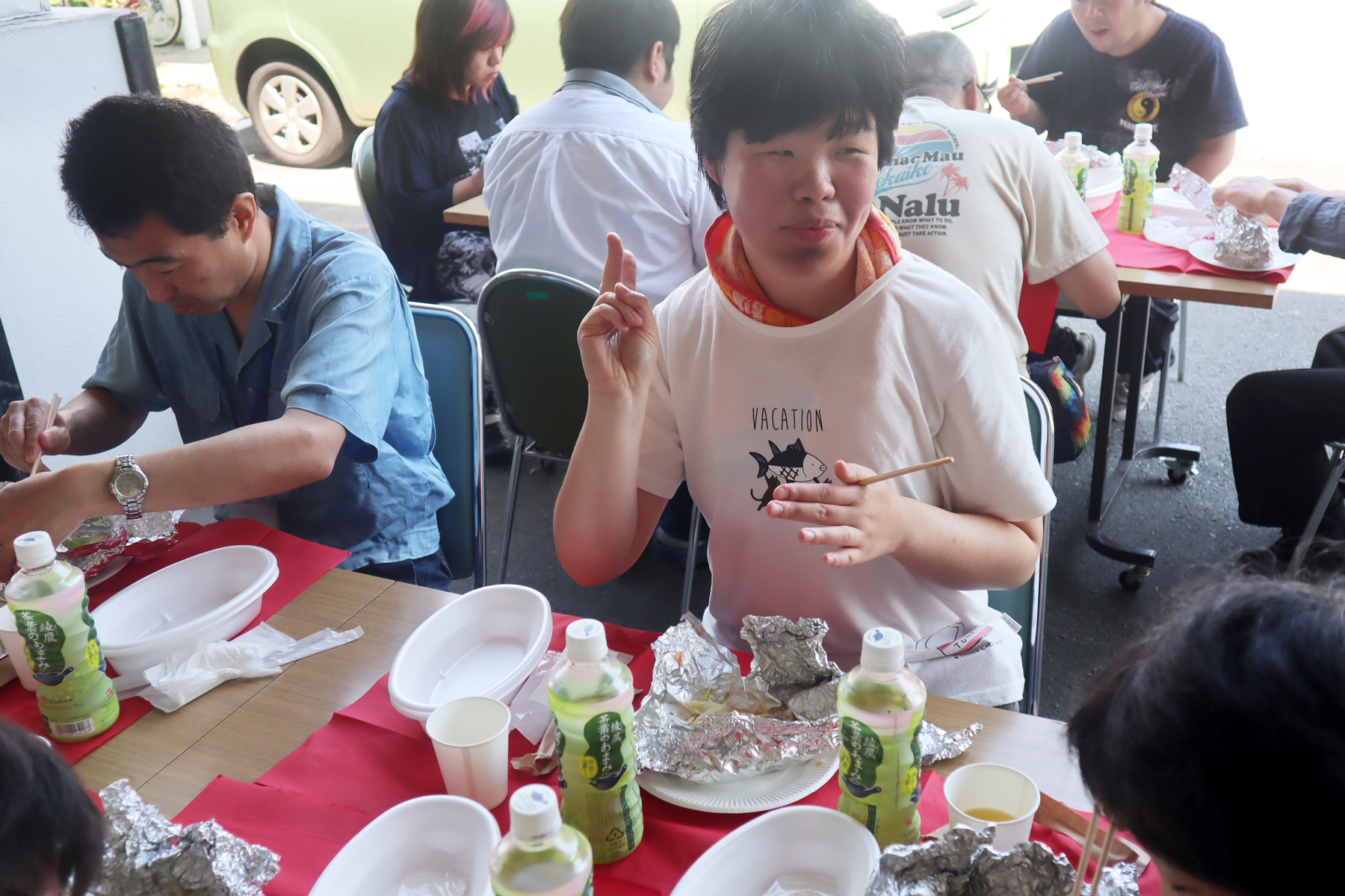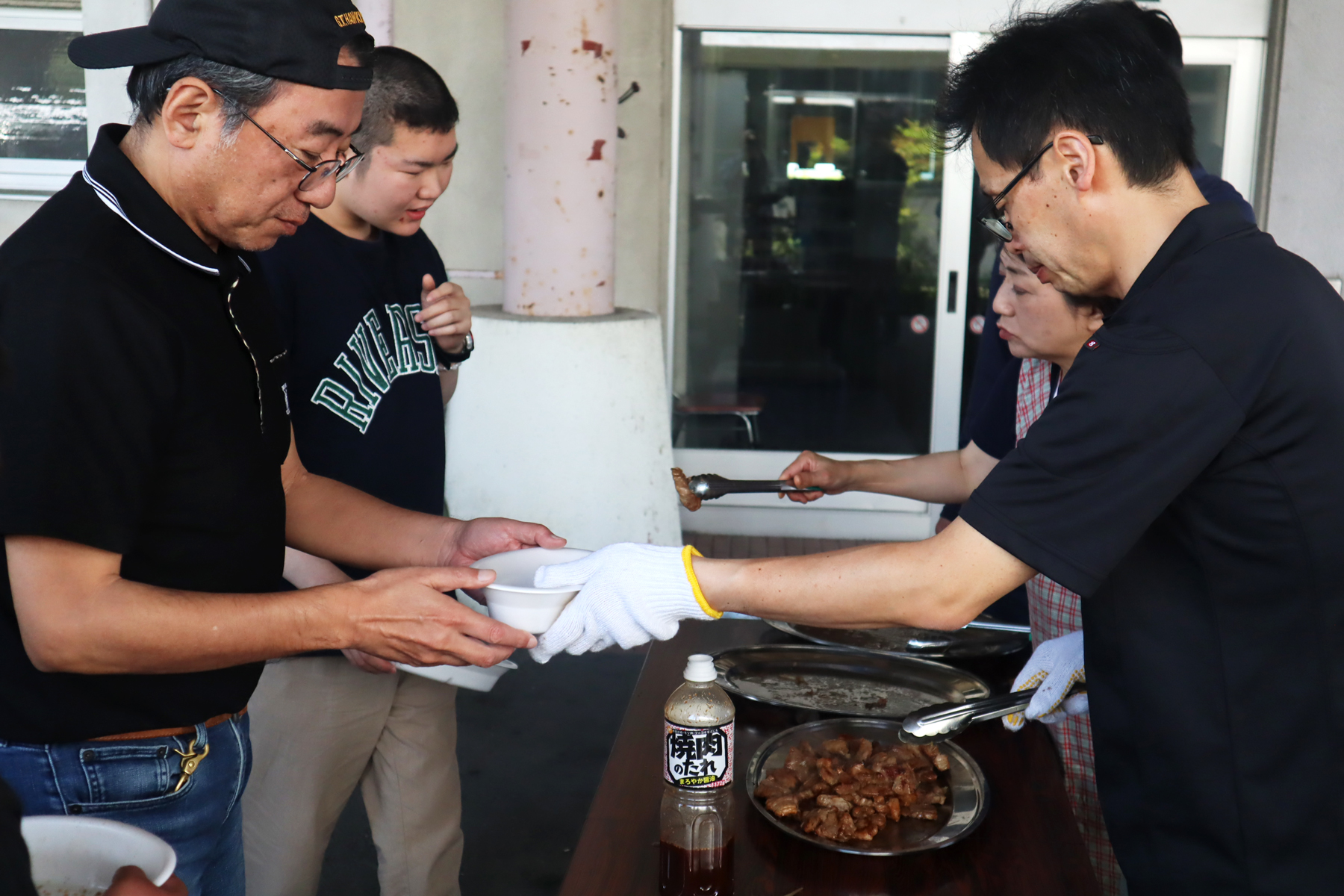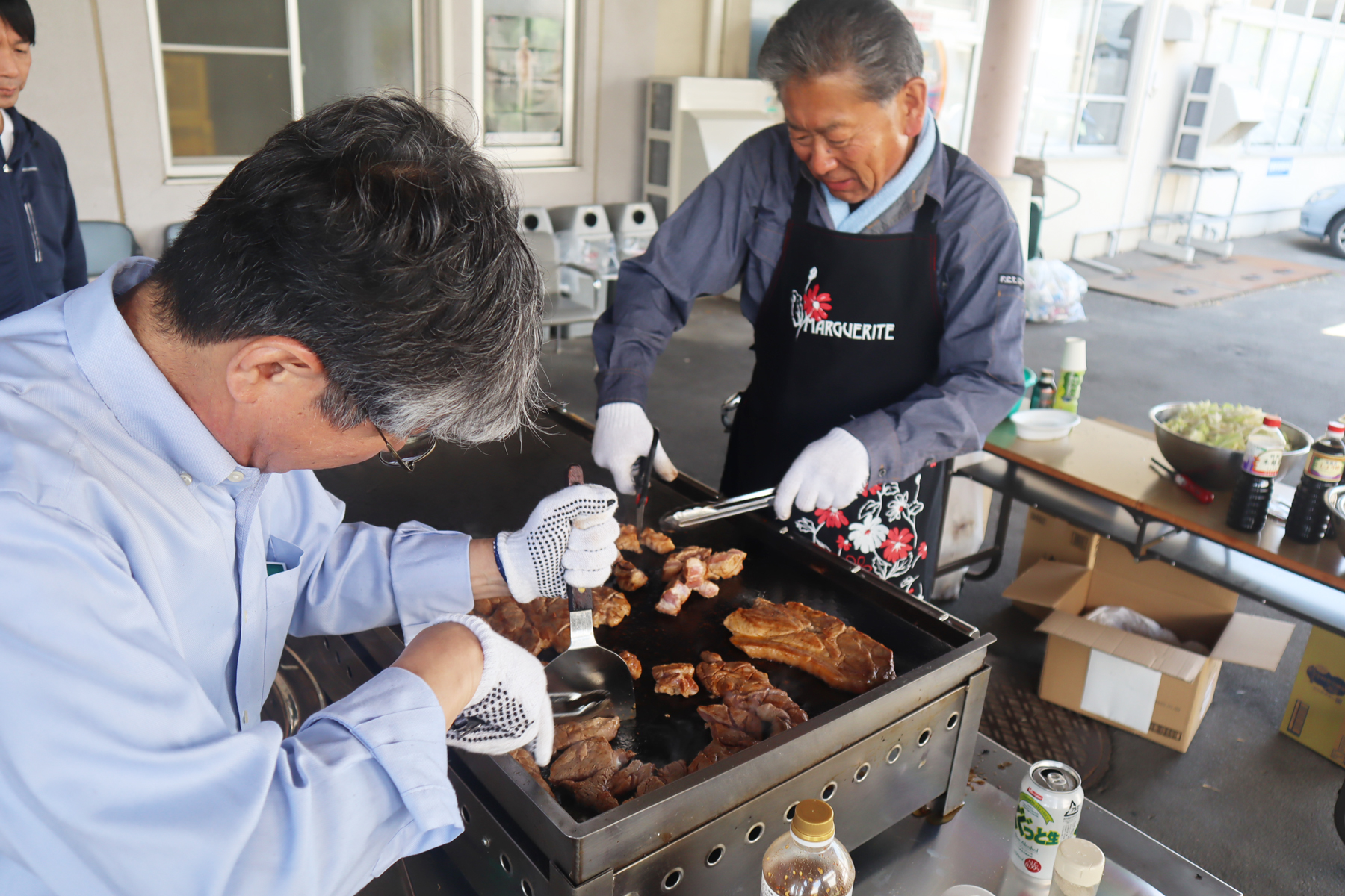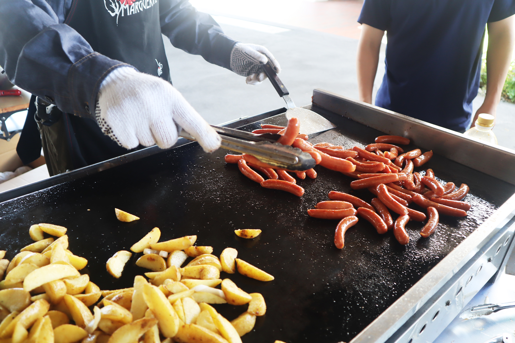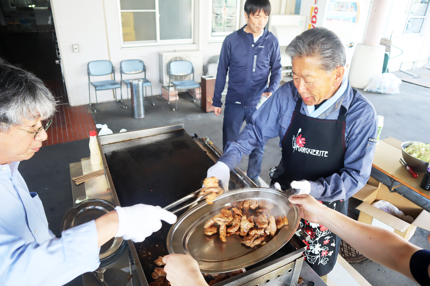 牛肉に豚肉、ソーセージにポテト。焼き担当は所長をはじめ、男性職員の担当です。焼いたそばからどんどん売れていきます。「おかわりー!」