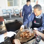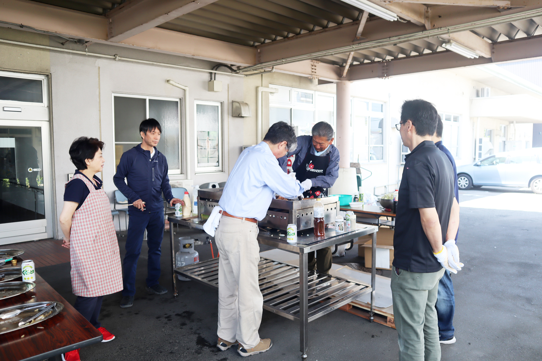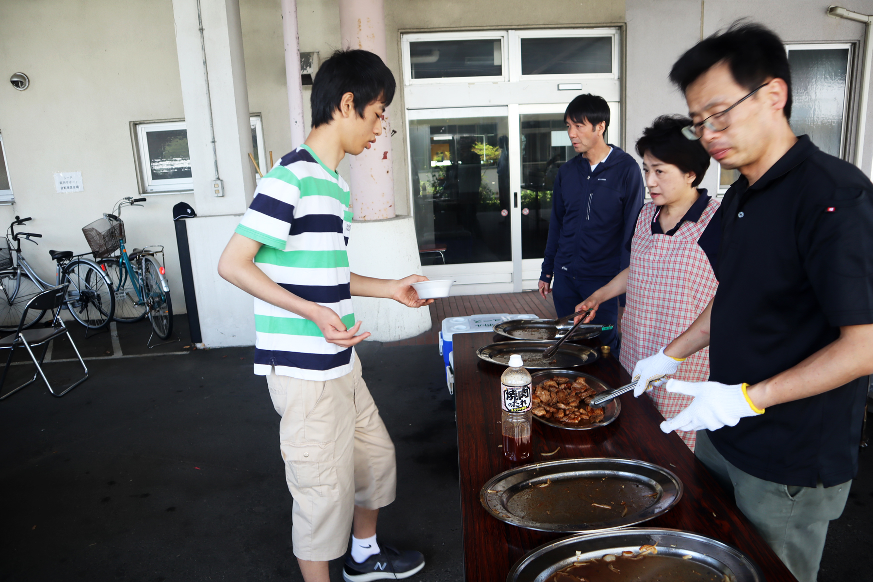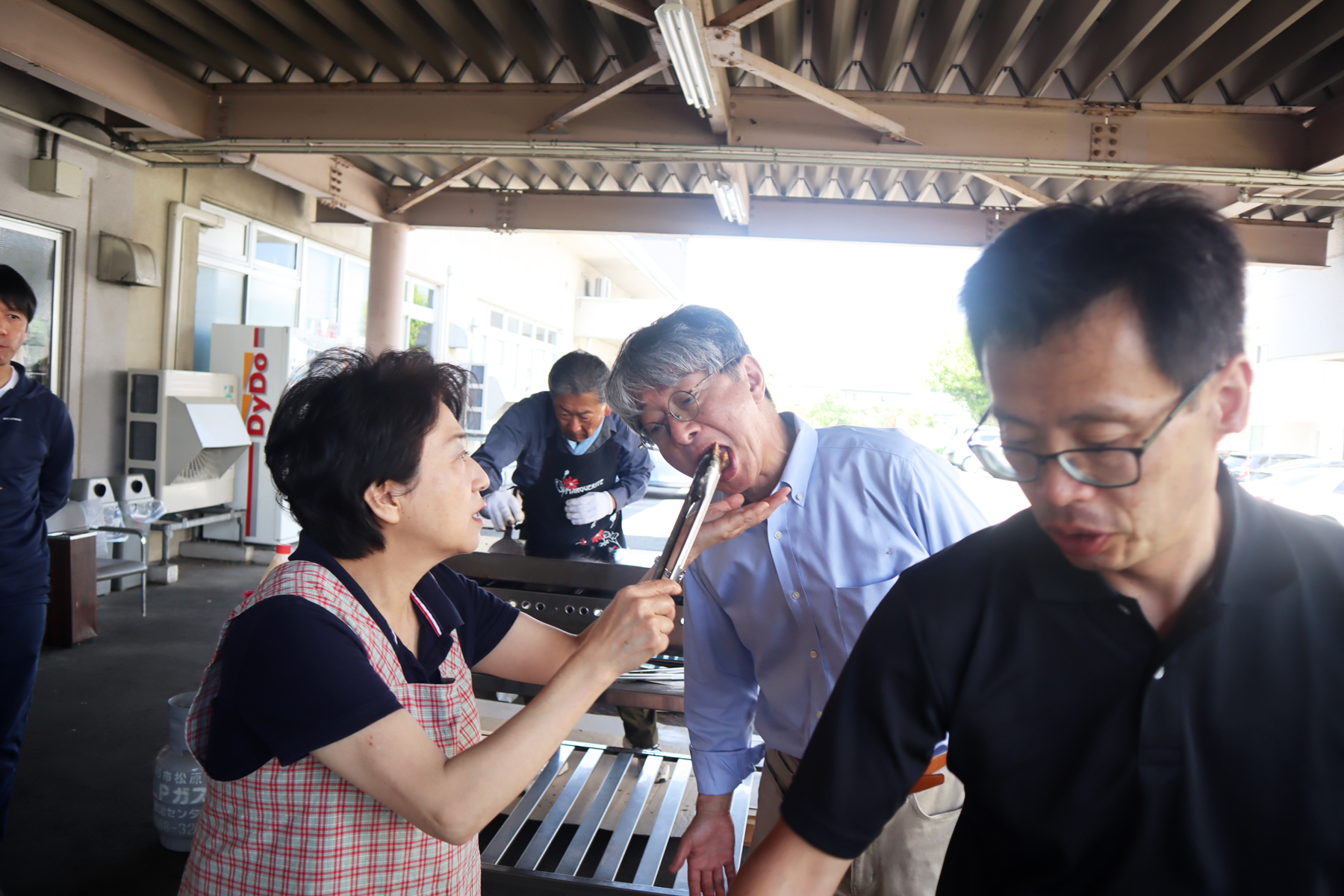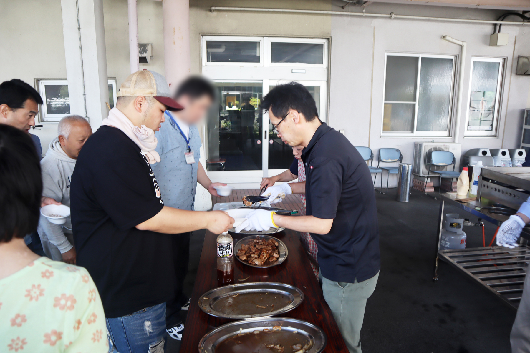 牛肉に豚肉、ソーセージにポテト。焼き担当は所長をはじめ、男性職員の担当です。焼いたそばからどんどん売れていきます。「おかわりー!」