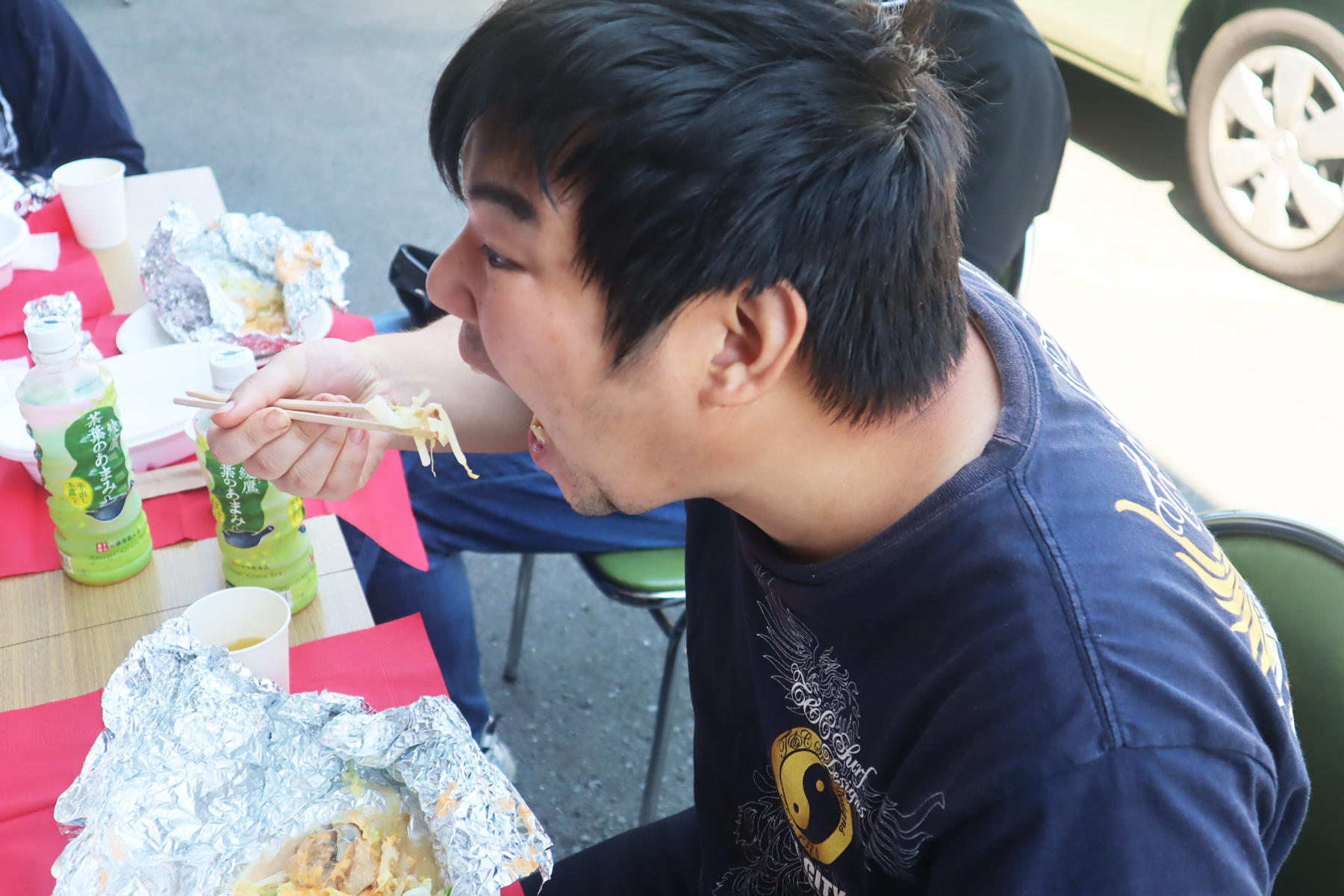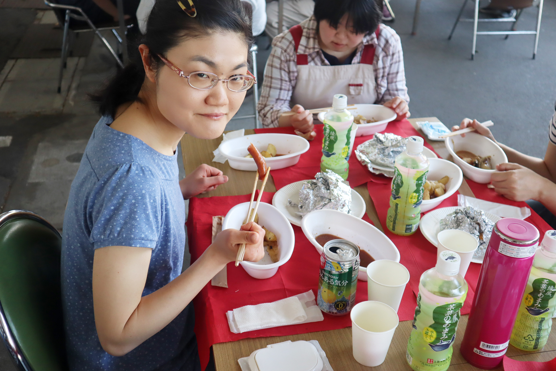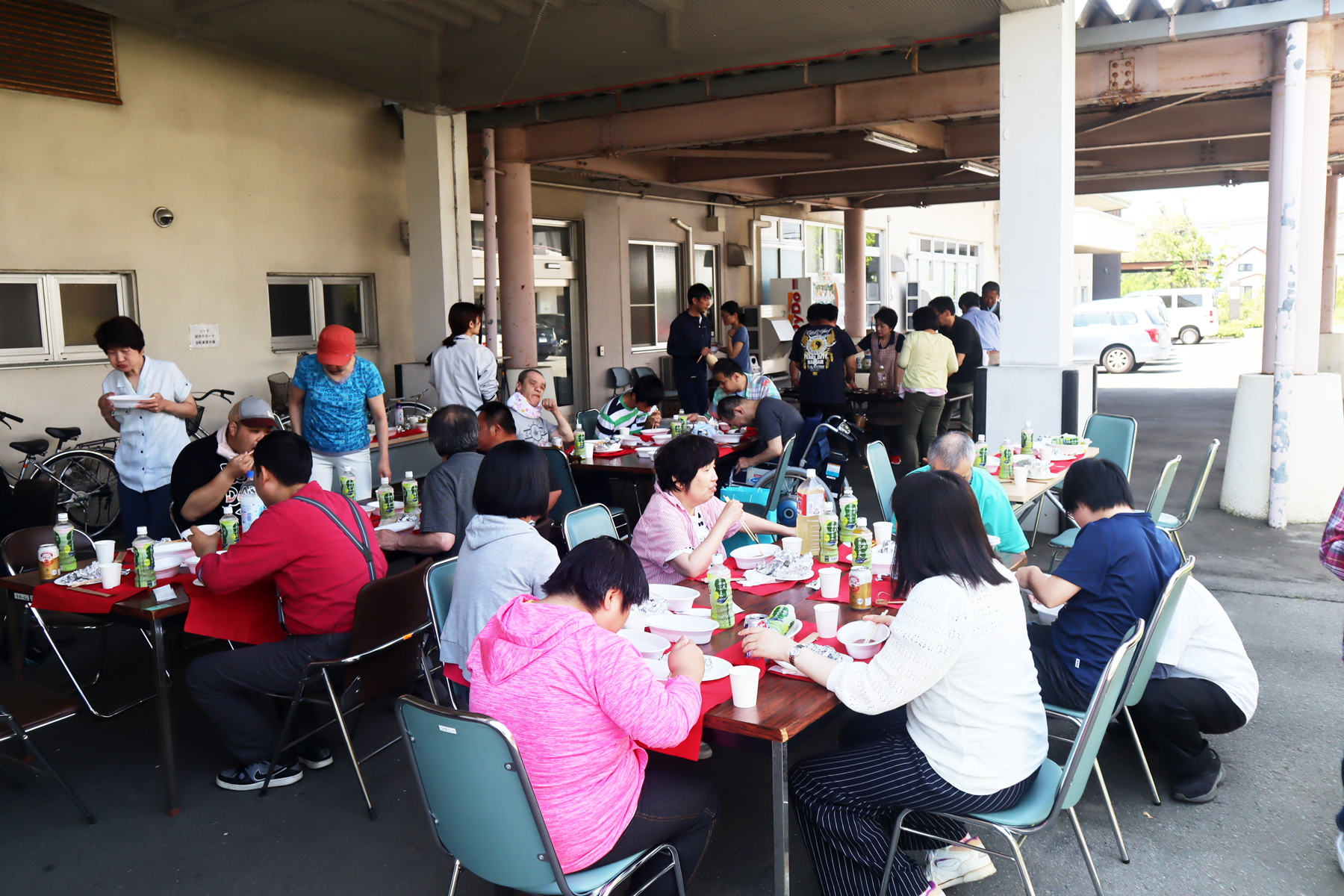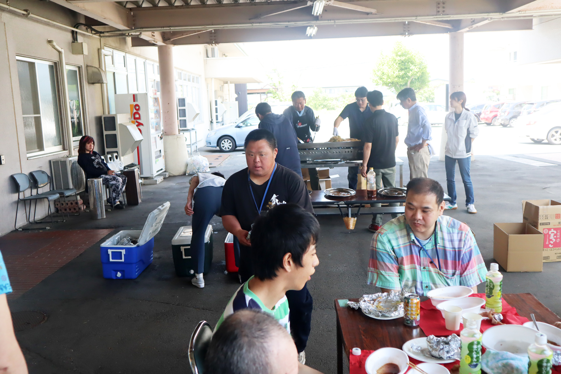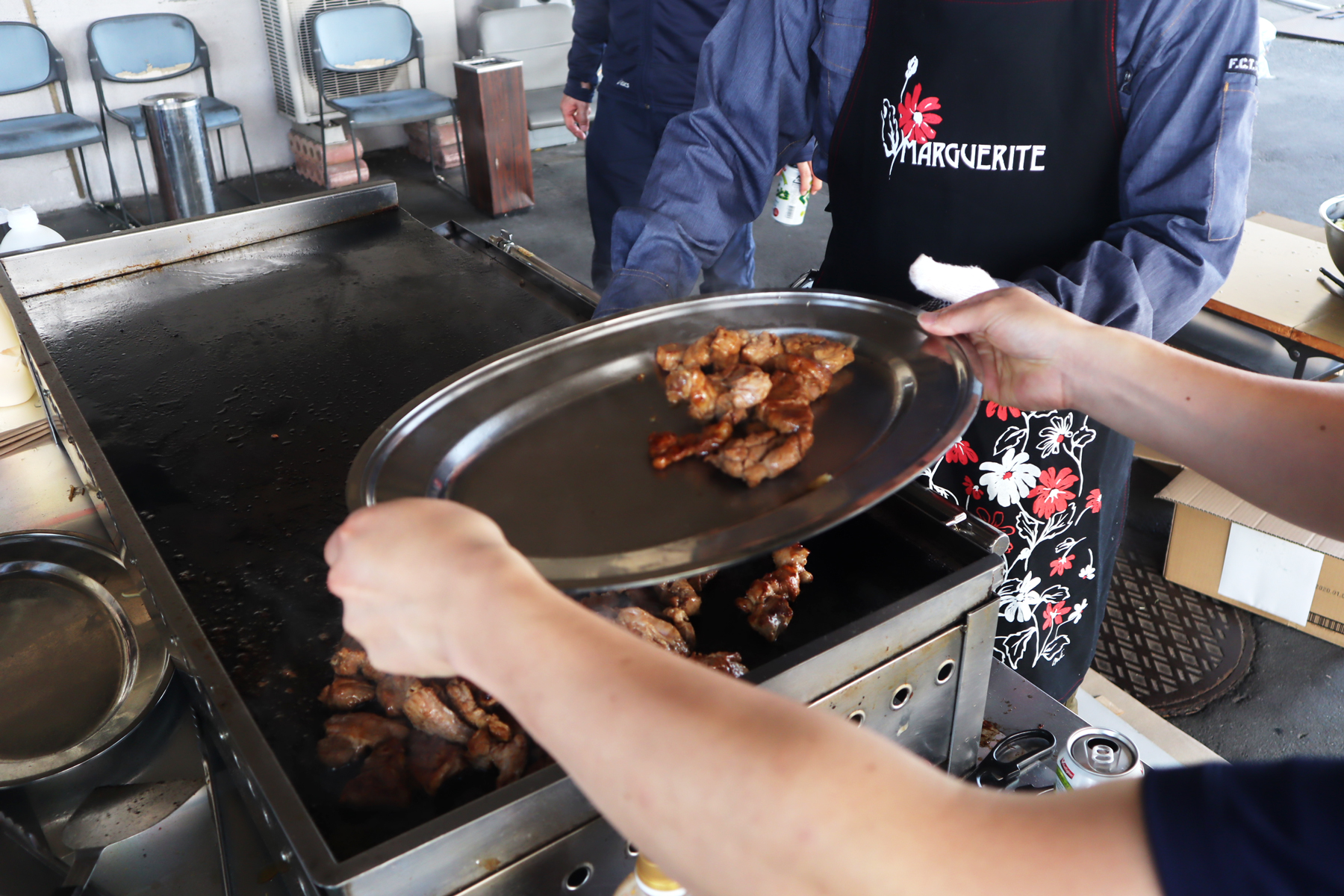 牛肉に豚肉、ソーセージにポテト。焼き担当は所長をはじめ、男性職員の担当です。焼いたそばからどんどん売れていきます。「おかわりー!」