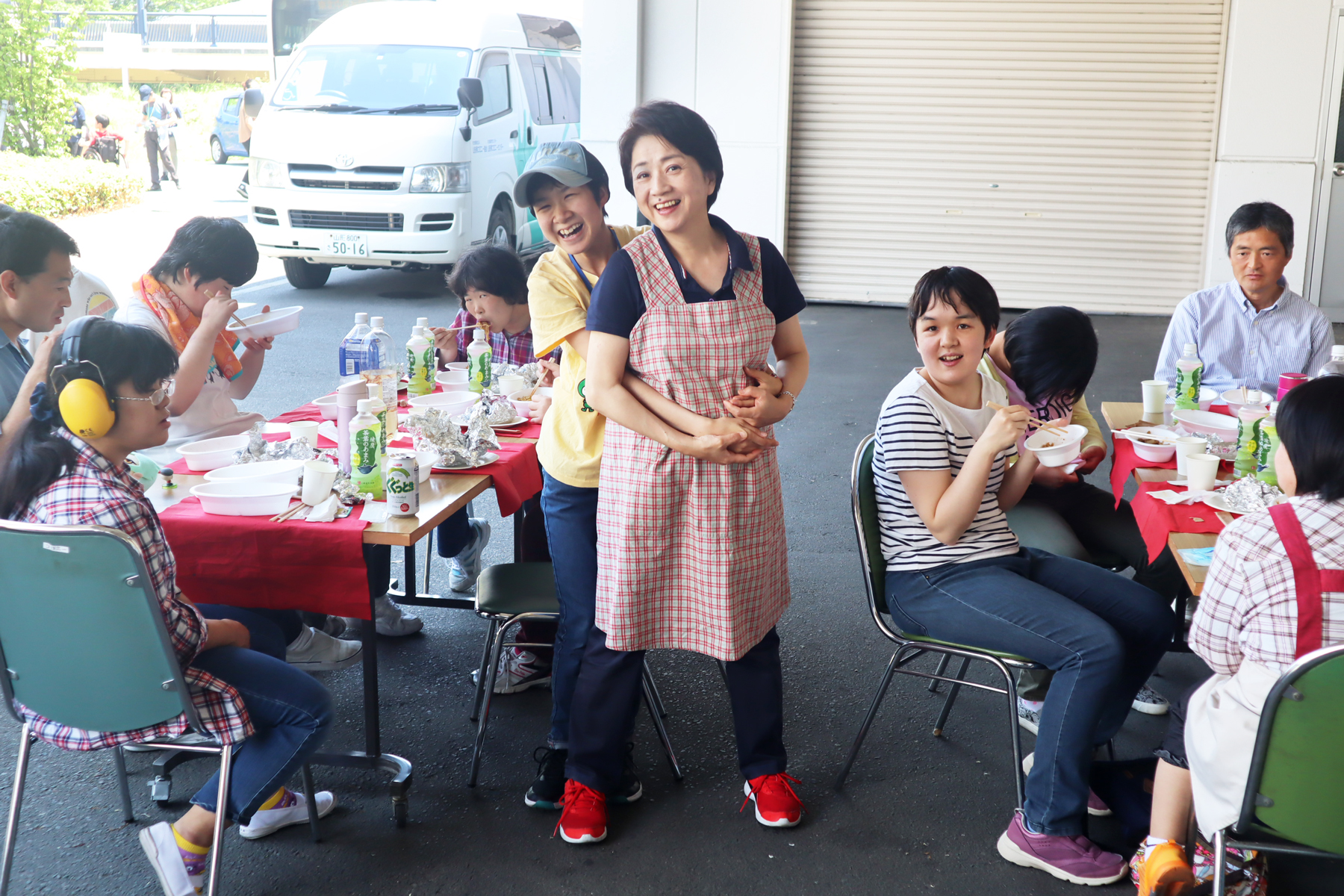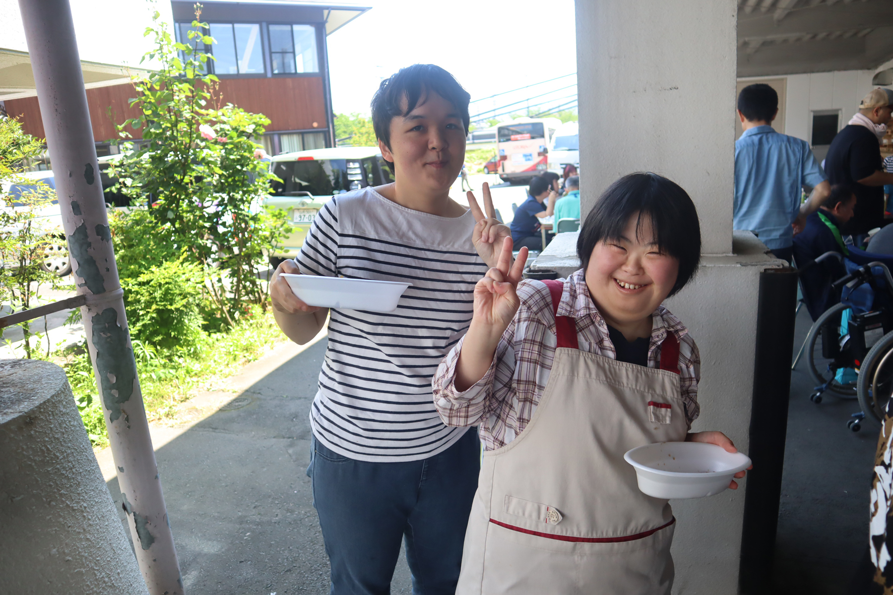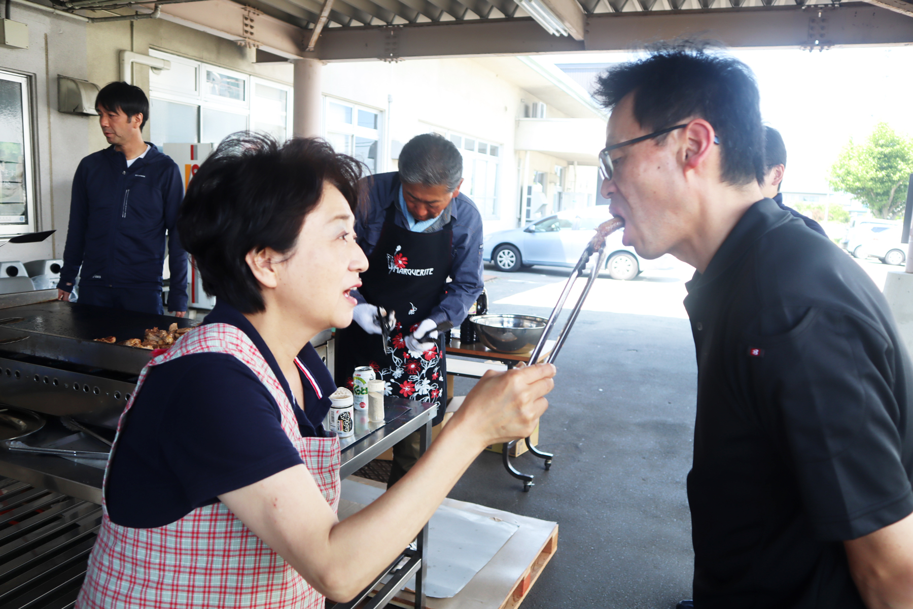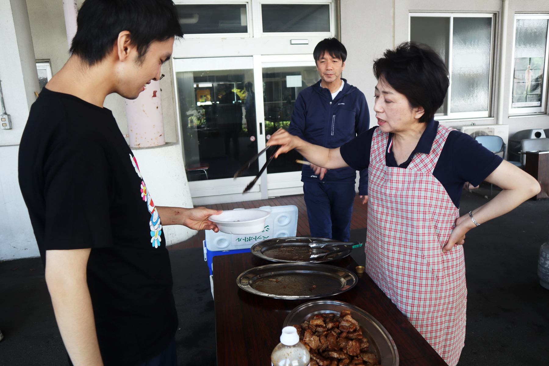 牛肉に豚肉、ソーセージにポテト。焼き担当は所長をはじめ、男性職員の担当です。焼いたそばからどんどん売れていきます。「おかわりー!」