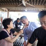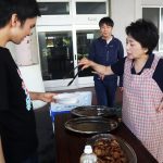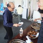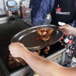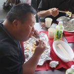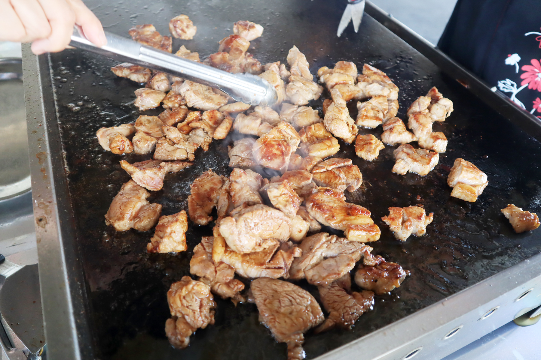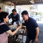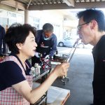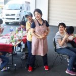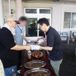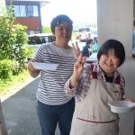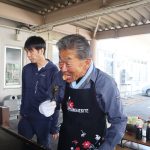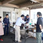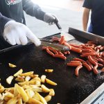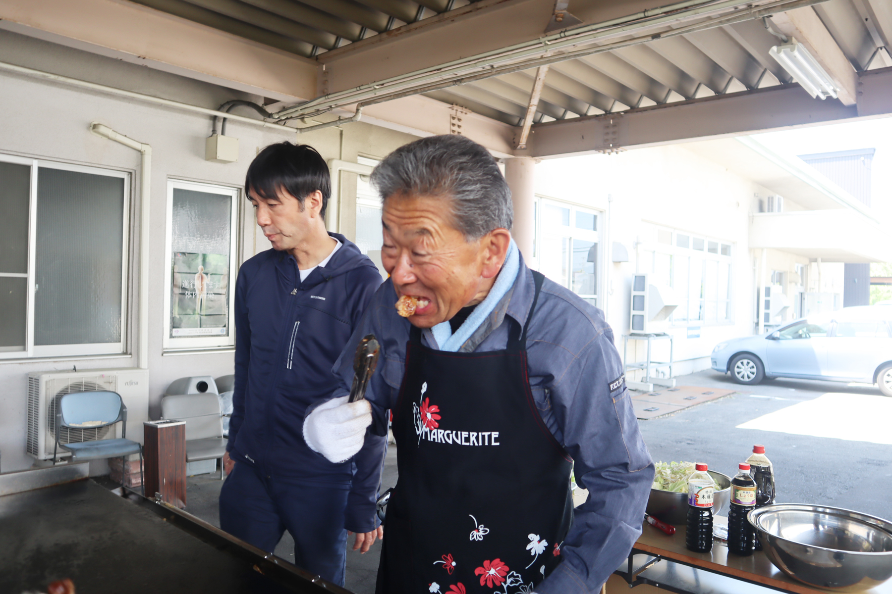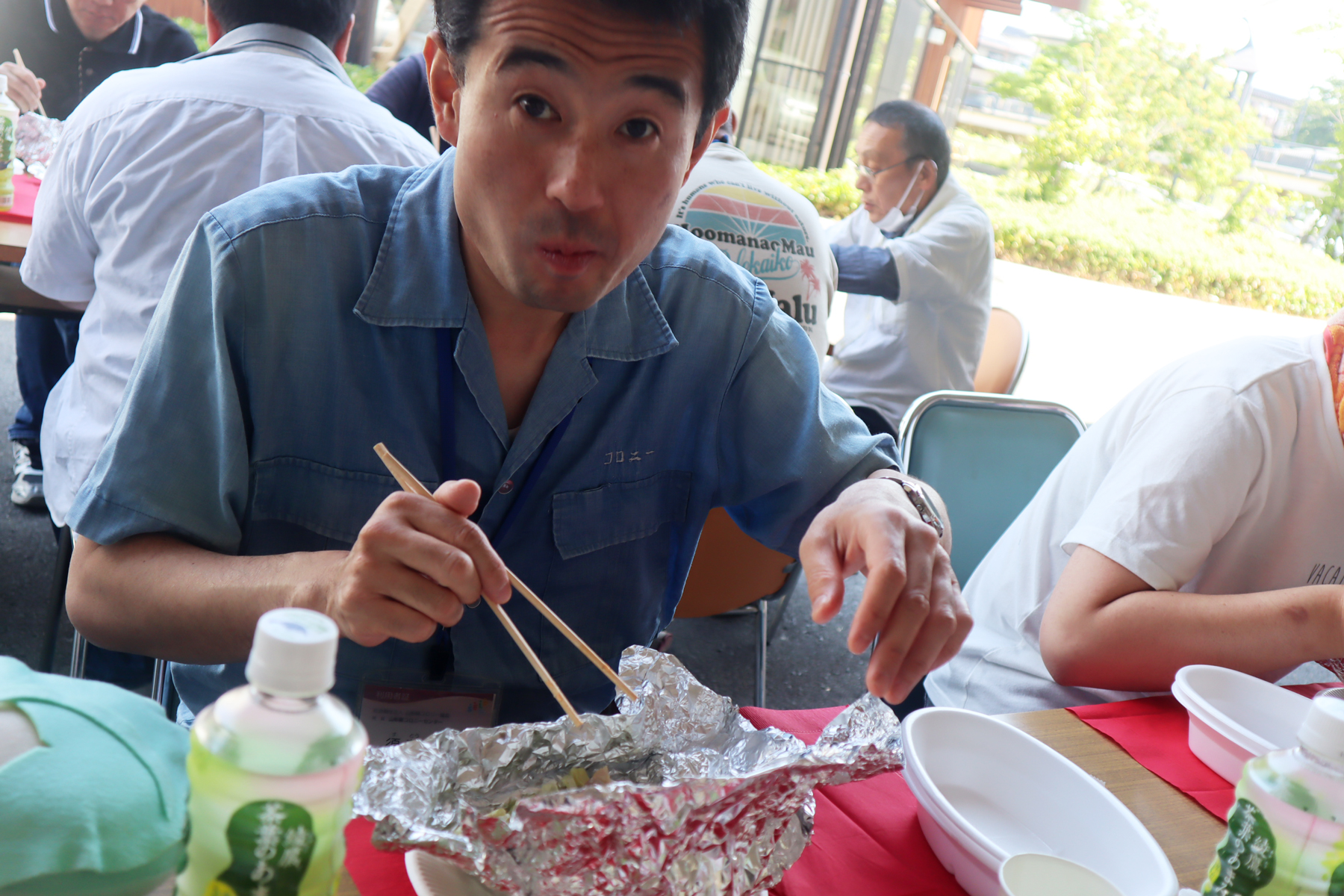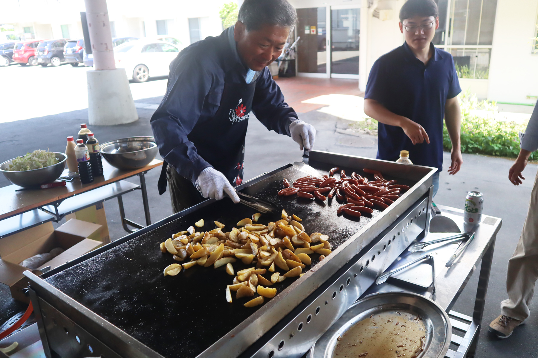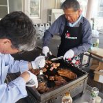 牛肉に豚肉、ソーセージにポテト。焼き担当は所長をはじめ、男性職員の担当です。焼いたそばからどんどん売れていきます。「おかわりー!」