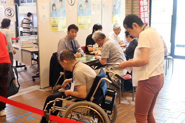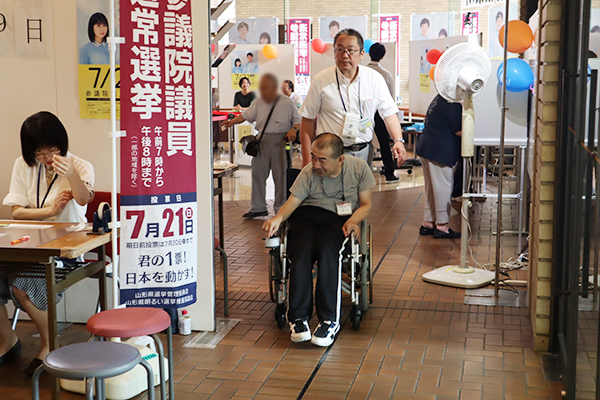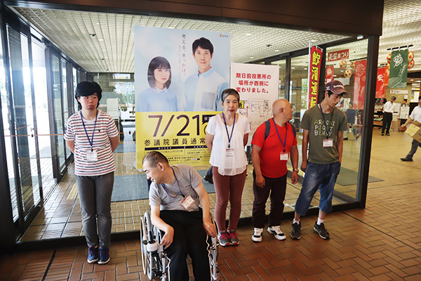 7月21日は、令和になって初めての国政選挙参議院選の投票日です。選挙権が18歳以上の成人となってからは、コロニーセンターを利用するすべての人にとっての関心事です。当日、投票に行くのが困難な人には、期日前投票を勧めています。今回も19日に職員2名が同行して投票に向かいました。