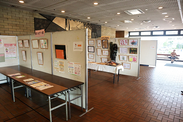 この日は、市役所1Fギャラリーにおいて、≪障がい者アート展≫も開催されていました。今回は、私たちの仲間の岡崎さんの作品が展示されているので、それを見学するのも目的の一つです。