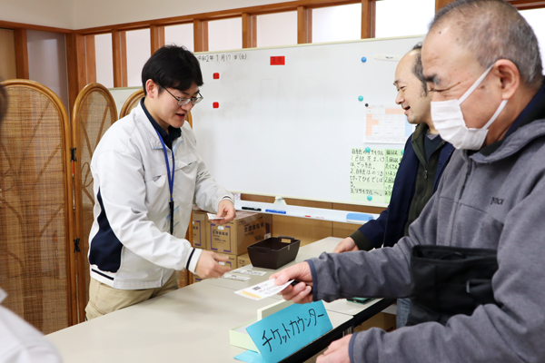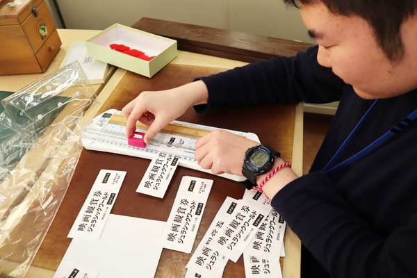 チケット一枚一枚にミシン目を入れ、この映画招待券とフードチケットを「当日に忘れずに持ってきてください」と言い、一人一人に配布しました。
