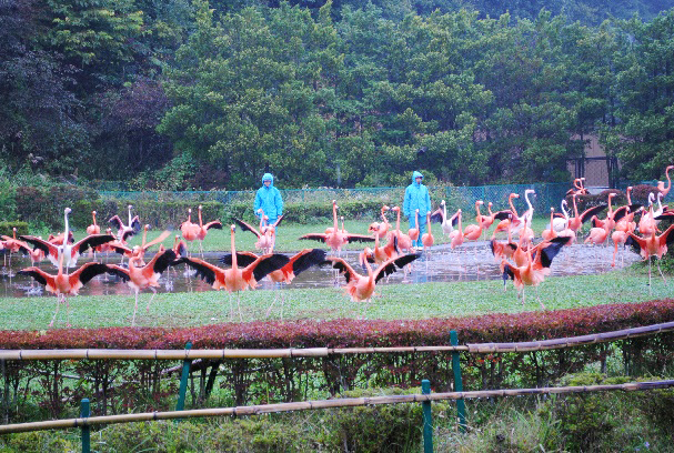 雨の中の<フラミンゴショー> みんな初めて見ました。寒かったね。