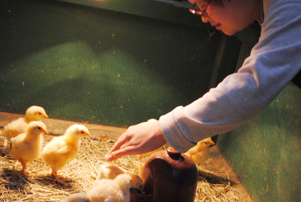 なんてかわいいヒヨコちゃんでしょう♥ ここはパーク内の<小動物ふれあい広場> 手を差し伸べると、3羽のヒヨコが寄ってきました。