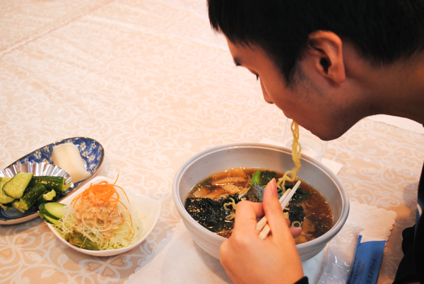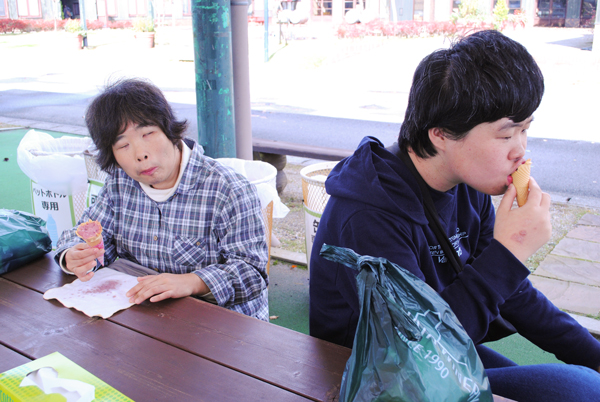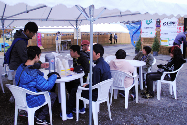 旅は始まったばかりなのに、なぜだか、「饅頭でも食おう!」ということになり、設営されているテラスで、お饅頭とゆべし、それにアツアツのほうじ茶をいただきました。そして当然、トイレタイム。
