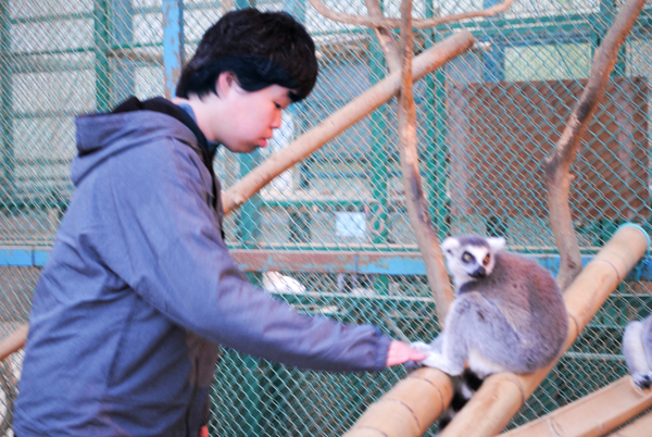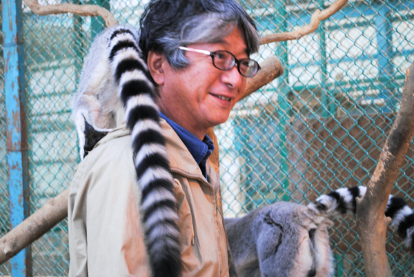 我らが所長に、輪尾長サルが飛び乗りました。動物にもモテモテ。