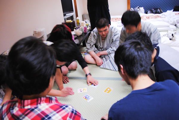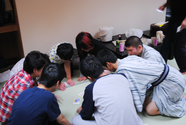『男女対抗生活かるた選手権大会』が男子部屋で始まりました。真ん中の青年は親分さんで?