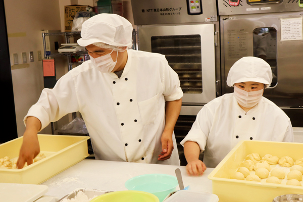 生地を丸める作業をしています