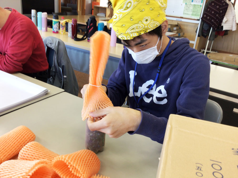 アルミ缶をつぶしてリサイクル担当が回収業者へ持って行きます。