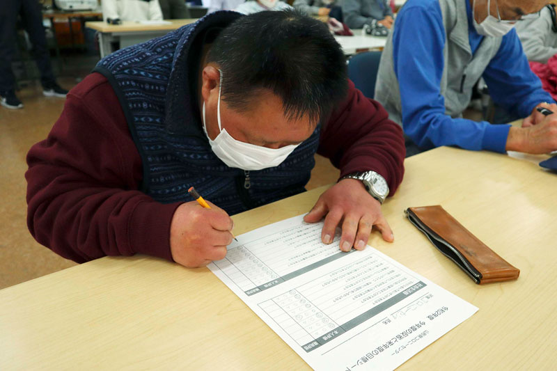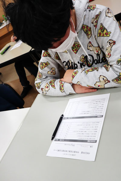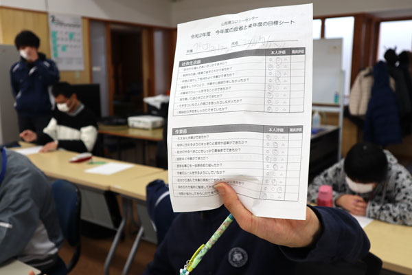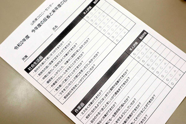 ブログを見た後は、振り返りシートで《社会生活面》《作業面》の自己評価をします。「作業中居眠りをしなかったか」「進んで挨拶できたか」…など。