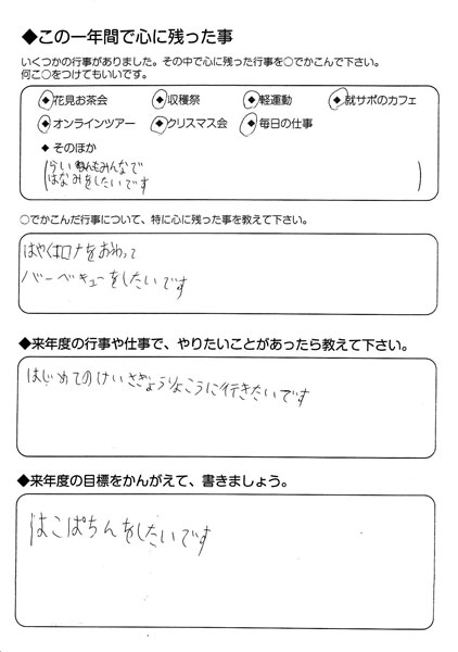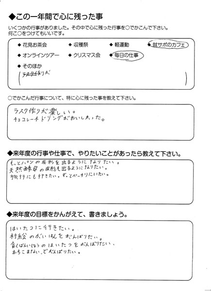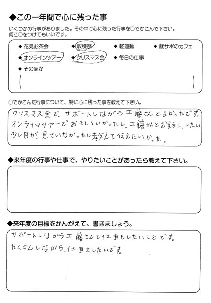 行事:クリスマス会またやりたい。研修旅行に行けたら嬉しい。」
