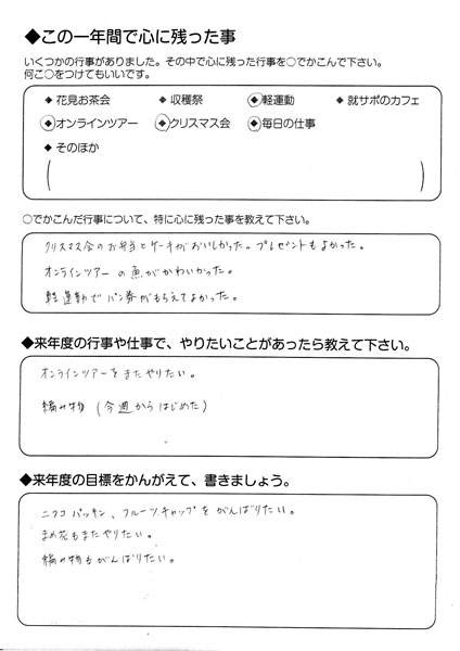 「私は、収穫祭が楽しかった事です。花見お茶会も楽しかったし、軽運動も楽しかったし、オンラインツアー等も楽しかったです。」