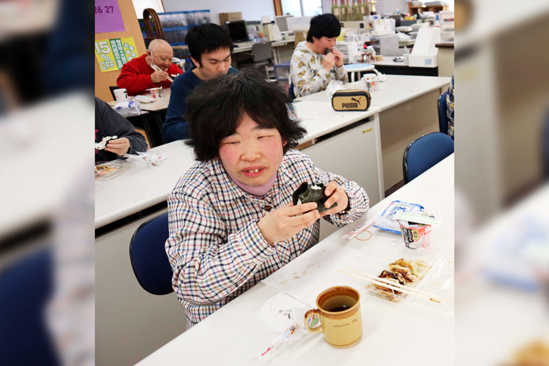 コロニーセンターと同じB型事業所である《ワークランドべにばな》の焼きたてニンニク餃子1人1パック(6個入)とおにぎり、それにデザートは杏仁豆腐です。