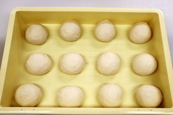 ②翌朝、昨日寝かせた天然酵母の生地を成型するパンに合わせて分割して丸め、そのパンを50分間発酵させる。