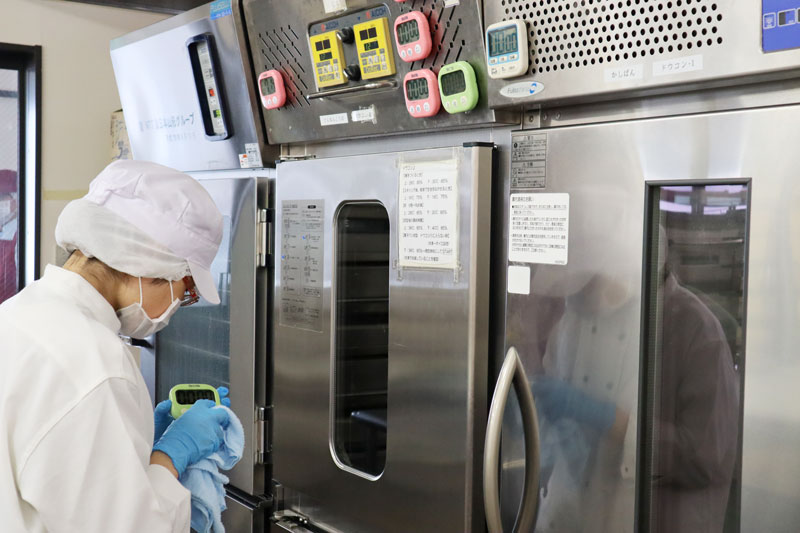 - 粉だらけのタイマーを一つ一つ丁寧に拭いています。