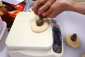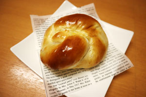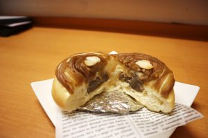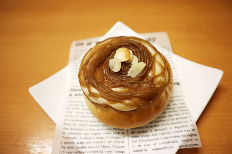今回は『天津甘栗あんぱん』です。甘さ控えめで粒入りの栗あんを使用しています。¥160(税込)