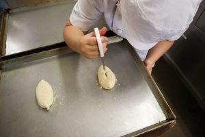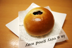 今回は『ブルーベリージャムパン』です。甘酸っぱい味わいのジャムがたっぷり入っています。¥160(税込) -