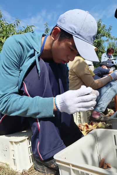 それでは、早速作業にはいります。最初の30分はみんなで落ちているアーモンドの実を拾います。