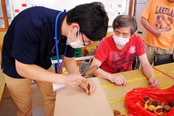 みな興味深々です。トンカチで堅い殻を割り、中から白い部分を取り出します。