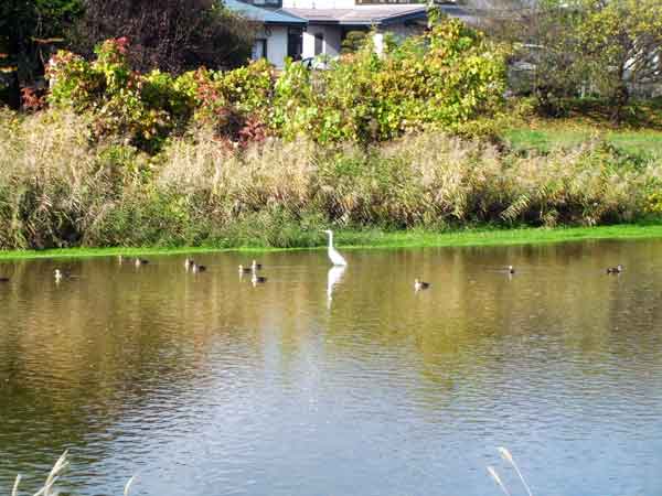 ベーカリーの店の中から見える須川では、シロサギとカモが寒い中元気に泳いでいます。