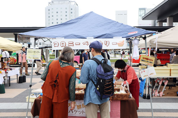 9月30日(土)山形駅西口のイベント広場にて、『秋のにこにこマルシェ』が開催されました。今年も出店し、利用者さんと一緒にコロニーパンの販売を行いました。
