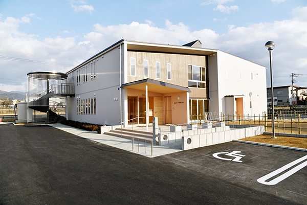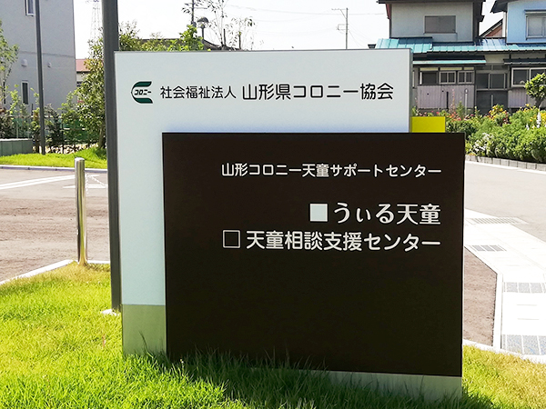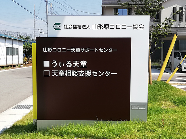 建植サインは平成31年4月27日に行われた天童サポートセンター落成式において寄贈していただきました。高さ約160cm、幅約150cmの大きさで周囲の景観に溶け込んだ素晴らしいデザインになっております。職員一同改めて深く感謝申し上げます。