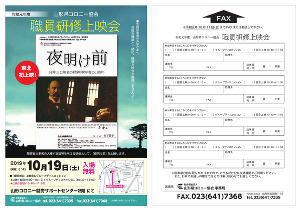 山形県コロニー協会では、10月19日(土)に職員研修上映会を開催します。