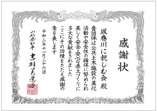 令和2年11月26日(木)法人職員有志で構成する「坂巻川に親しむ会」が、山形県より感謝状をいただきました。