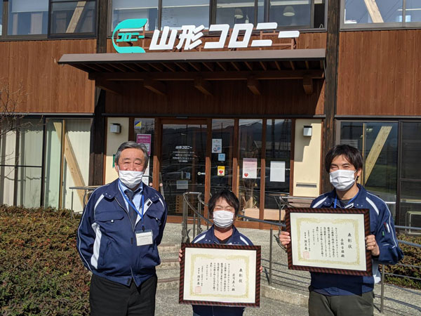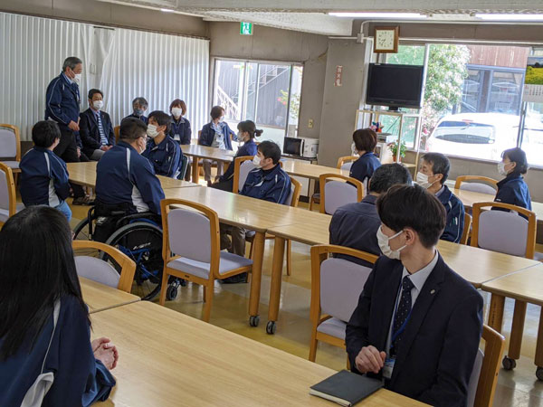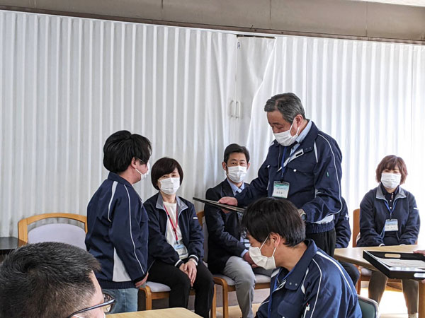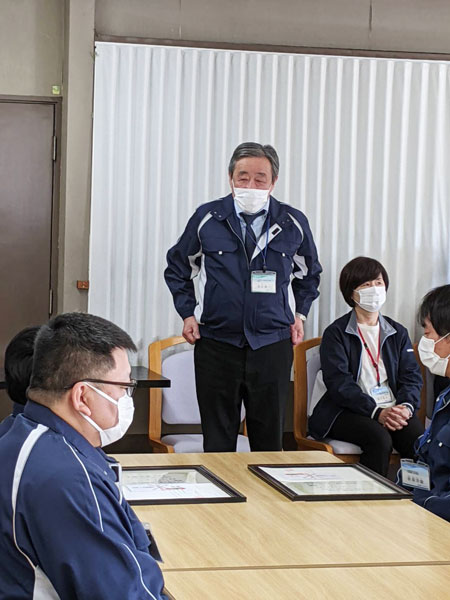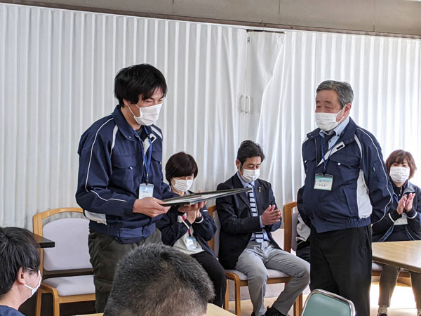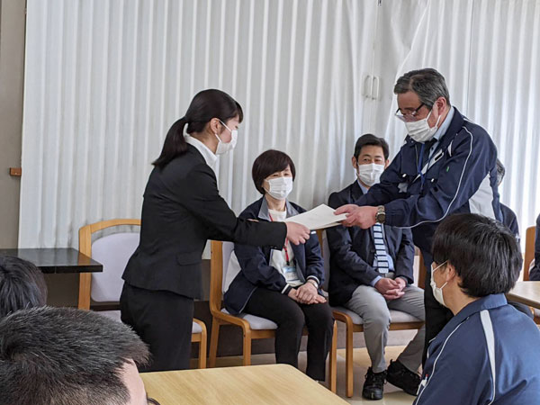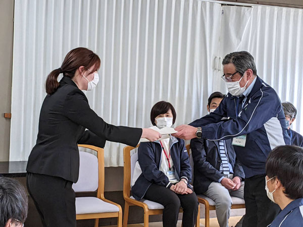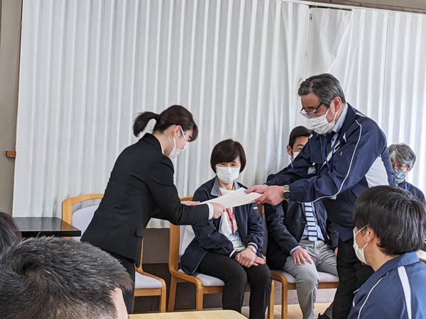 敷地の椿も満開になった青空のもと、 令和3年度の辞令交付式と 永年勤続表彰が行われました。 コロニー協会は5名が新しいスタッフとして加わり、 新年度をスタートしました。