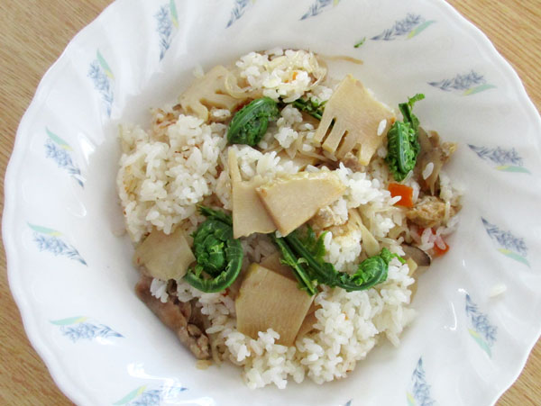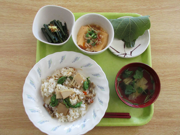 メニューは、筍と山菜ご飯・若筍と若芽三つ葉の清汁・ワラビのお浸し・卵豆腐ひき肉あん・かしわ餅になります。