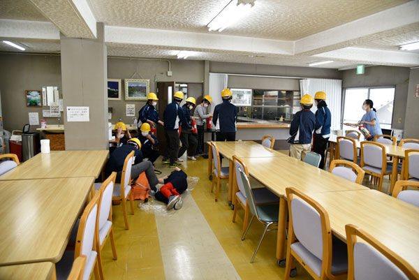 今回は、大規模地震発生、その後厨房からの火災発生を想定した避難訓練です。