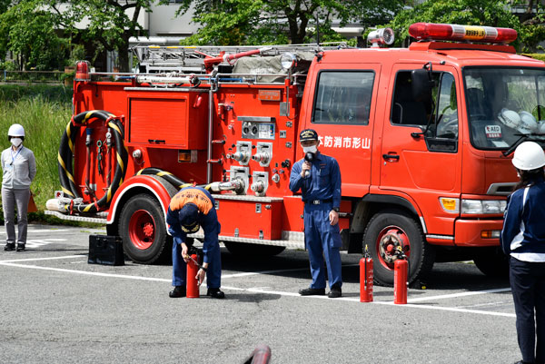 全員避難したあと、消防職員の方より水消火器の使用方法を指導していただきました。