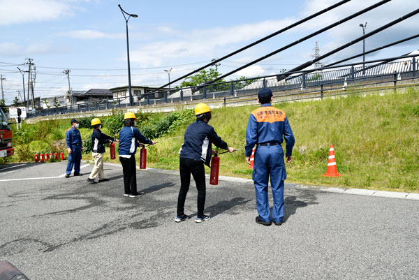 火に見立てた三角コーンに向かい噴射させます。火災を想定した消火器の操作方法を学ぶことができました。