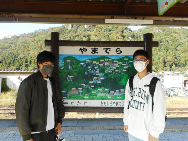 達成感に浸りながら、山寺駅のホームで、ハイポーズ!!