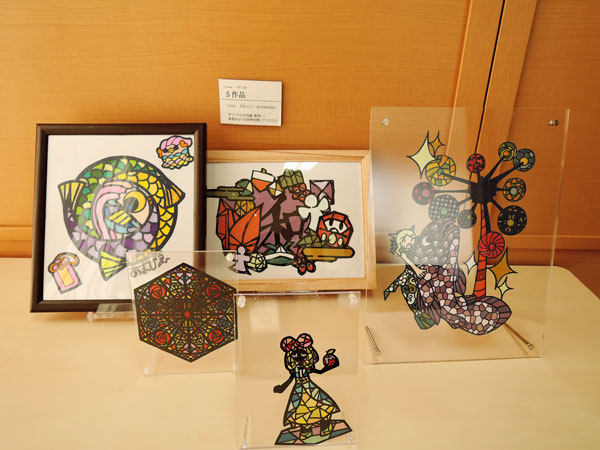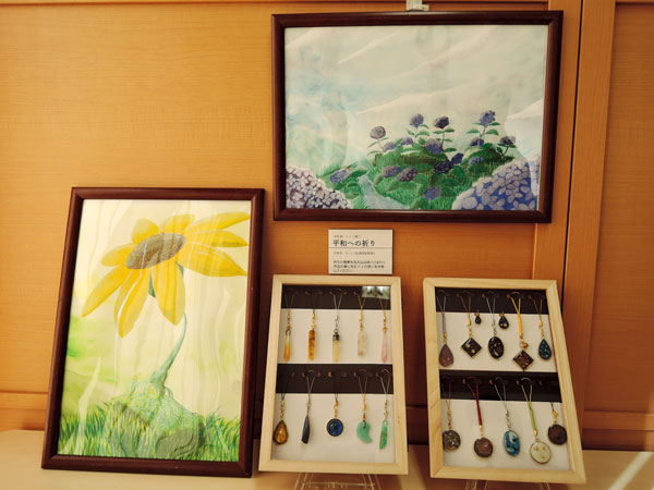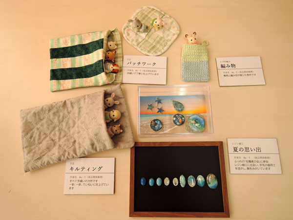 ふぅれの「在職者の会」でレジン細工に出会い、ご自宅でもレジン作品を作っているそうです。また、パッチワーク、キルティング、編み物作品も出展してくださいました。手縫いで作られているそうです。とても器用ですね。