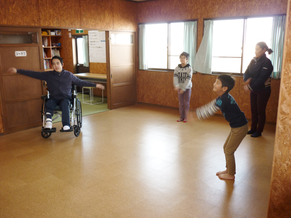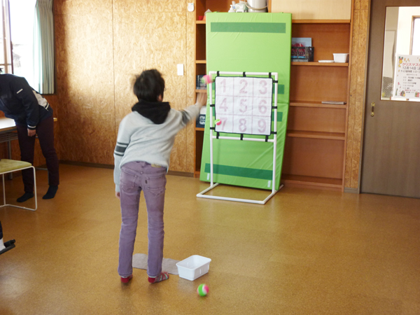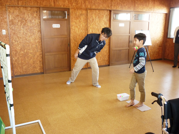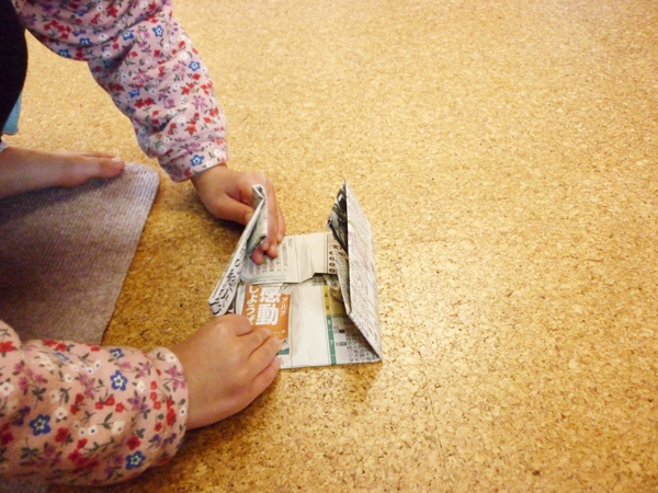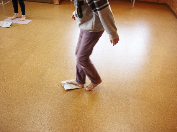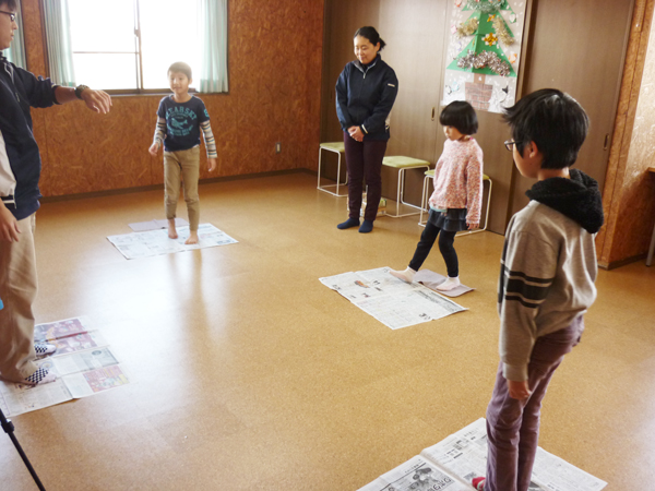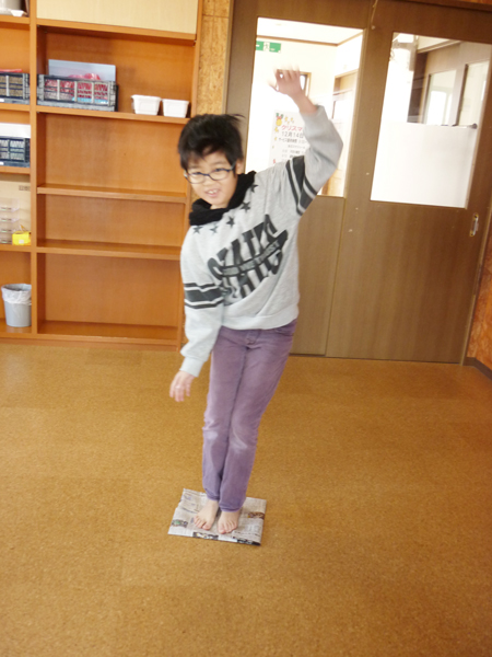 回数を重ねるごとに小さくなっていく新聞紙から落ちないようにバランスをとります。