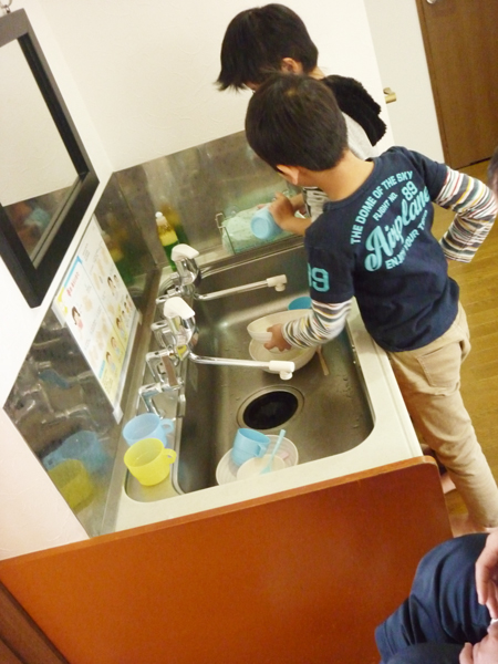 テーブル拭き、皿洗い、皿拭き、テーブル・イスの片付けと役割分担を決め、それぞれしっかりと片付けることが出来ました。