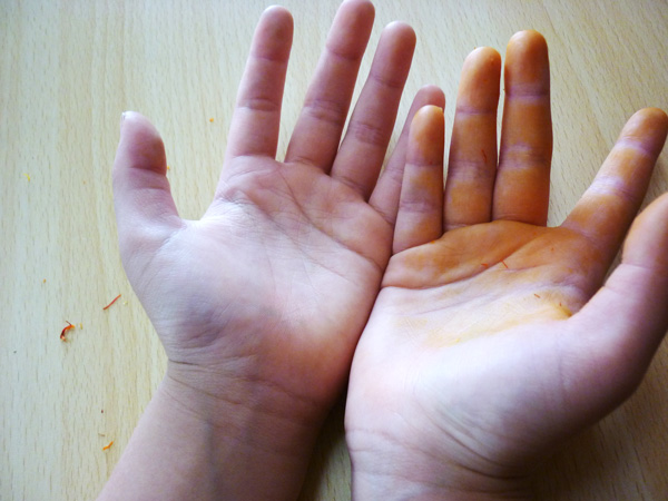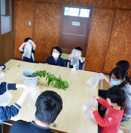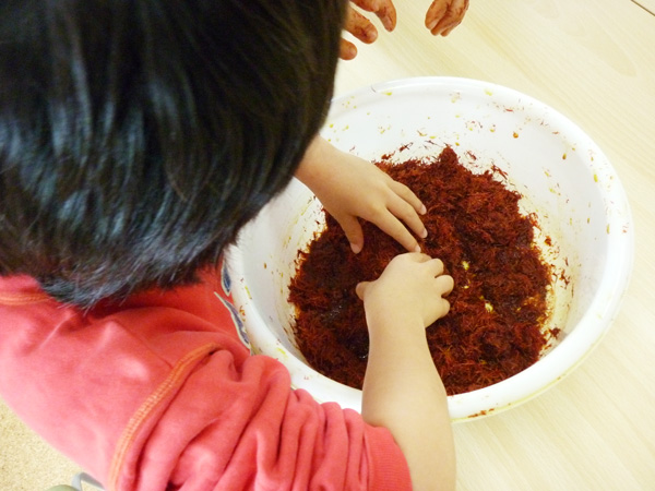 目で色を、鼻でにおいを、手で感触をたしかめます。