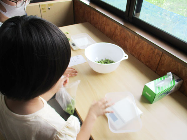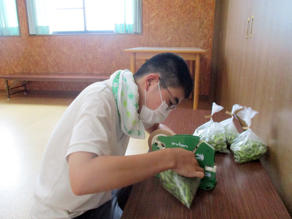 収穫作業は、中高生が畑で収穫し、小学生が室内で枝から豆を取るという7作業を行いました。その後、中学生と小学生が一緒に計量して袋に小分けしました。