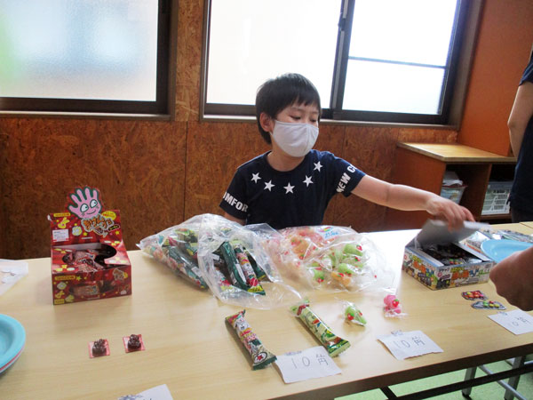 「駄菓子屋さん」好きなお菓子を買って食べる、その上、お店屋さんの体験もできる、おいしく楽しいおやつタイムでした。