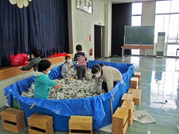 破いた新聞をプールに見立てふわふわの感触や新聞紙を破く指先の感覚や動作を楽しむ遊び。